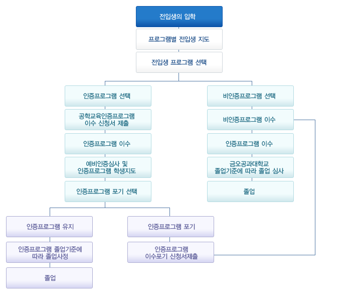신소재공학심화프로그램으로 편입, 전과, 복학한 전입생을 위한 수용정책은 아래 그림과 같다. 전입생은 프로그램 진입시 인증프로그램과 비인증프로그램중 선택을 하여 이수체계를 밟아가게된다.