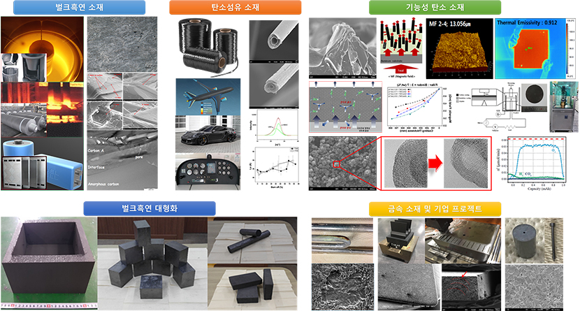 탄소재료연구실은 벌크흑연 소재 제조공정개발 및 분석, 탄소섬유 소재 구조해석 및 산화특성, 2차전지용 전극 활물질 연구, 전자파 차폐용 탄소소재 연구와 금속 소재의 부식, 피로파괴, 도금층 분석 외 기업 지원 프로젝트를 통해 탄소소재와 금속소재 분야를 연구하고 있습니다. 또한 기업 지원 프로젝트 연구를 통해 다양한 소재를 제조하고, 그에 대한 특성 분석 및 문제 해결을 수행하고 있습니다.