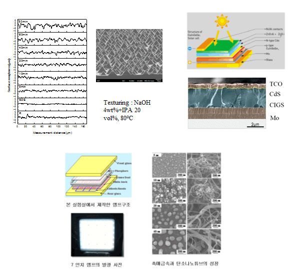 전자재료연구실은 디스플레이에 적용되는 탄소나노튜브 등의 나노재료합성과 공정개발, 그리고 태양전지에 사용되는 결정질 Si, 박막형 CIGS 등의 소재개발과 특성향상에 대한 연구를 수행하고 있습니다. 연구실에서 수행하고 있는 연구는 아래와 같습니다.